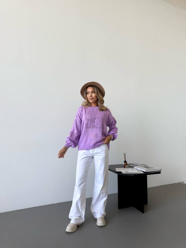 Жіночий в’язаний светр з ажурним візерунком бузкового кольору — стильна та комфортна модель для повсякденного гардероба. Ніжність, комфорт і вишуканий візерунок — все, що потрібно для гардеробу. М’яка напіввовняна пряжа приємна до тіла, добре зберігає тепло та забезпечує комфорт у прохолодну погоду. Завдяки універсальному крою светр красиво сідає на різні типи фігури та не сковує рухів.