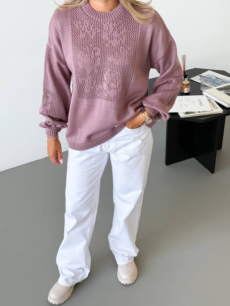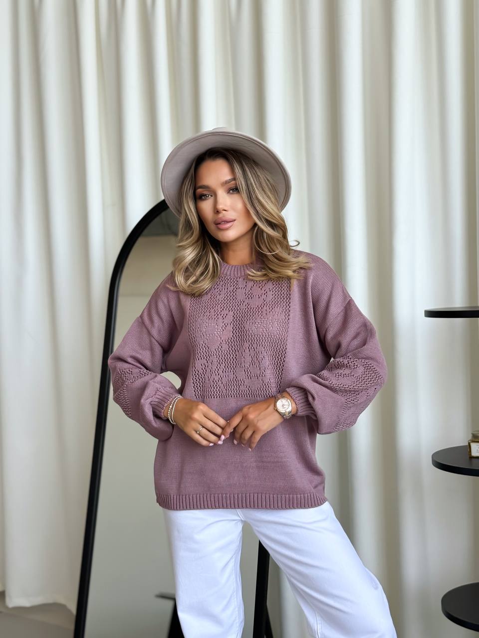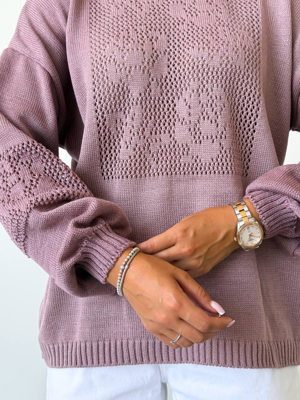 Модель виглядає елегантно та сучасно. Ажурне плетіння додає виробу витонченості та робить светр стильним акцентом у повсякденному образі. Светр легко поєднується з джинсами, класичними брюками або спідницями, створюючи жіночний та комфортний look.