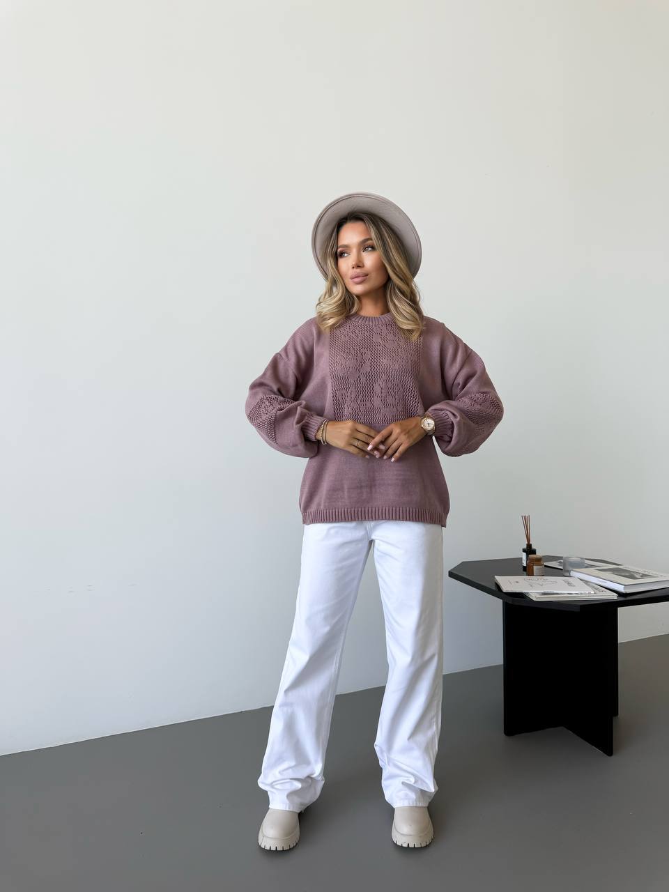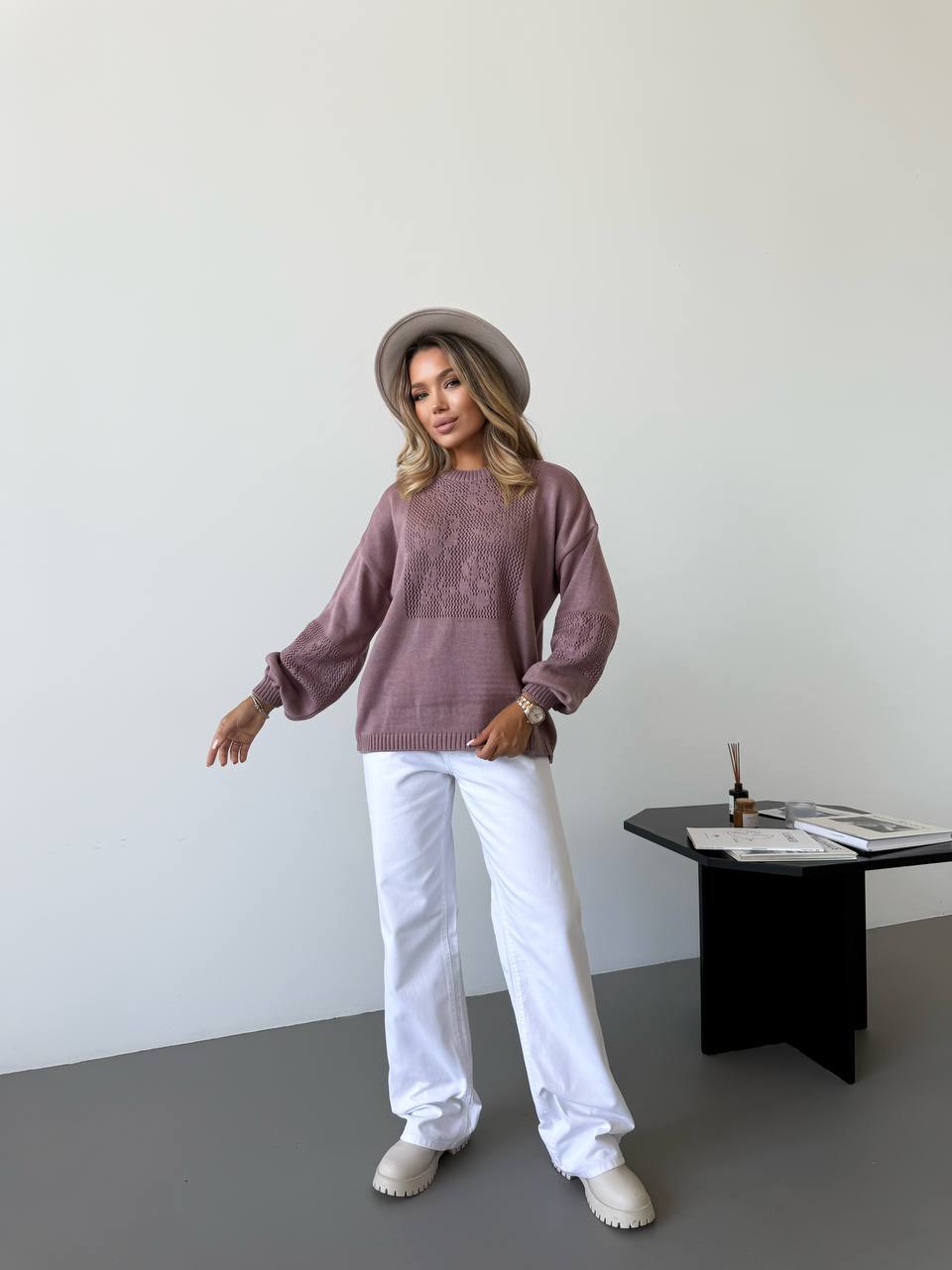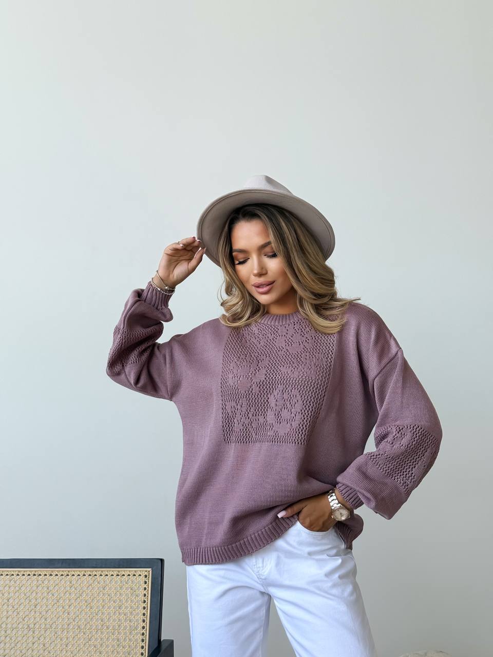 Модель виглядає елегантно та сучасно. Ажурне плетіння додає виробу витонченості та робить светр стильним акцентом у повсякденному образі. Светр легко поєднується з джинсами, класичними брюками або спідницями, створюючи жіночний та комфортний look.