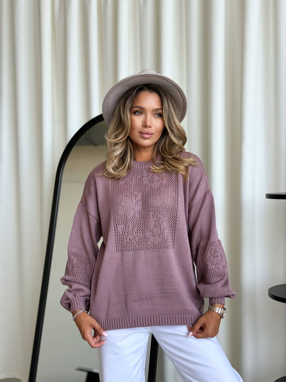 Жіночий в’язаний светр з ажурним візерунком кольору пудра 00582