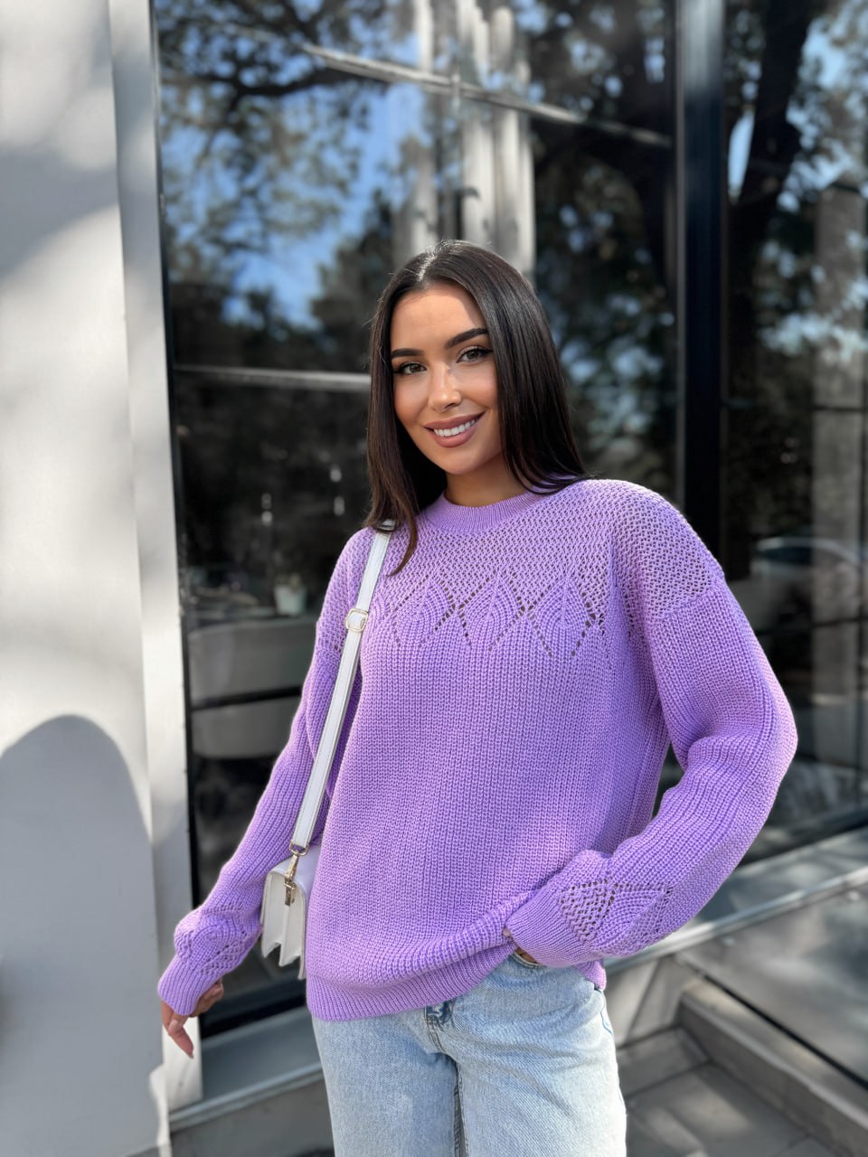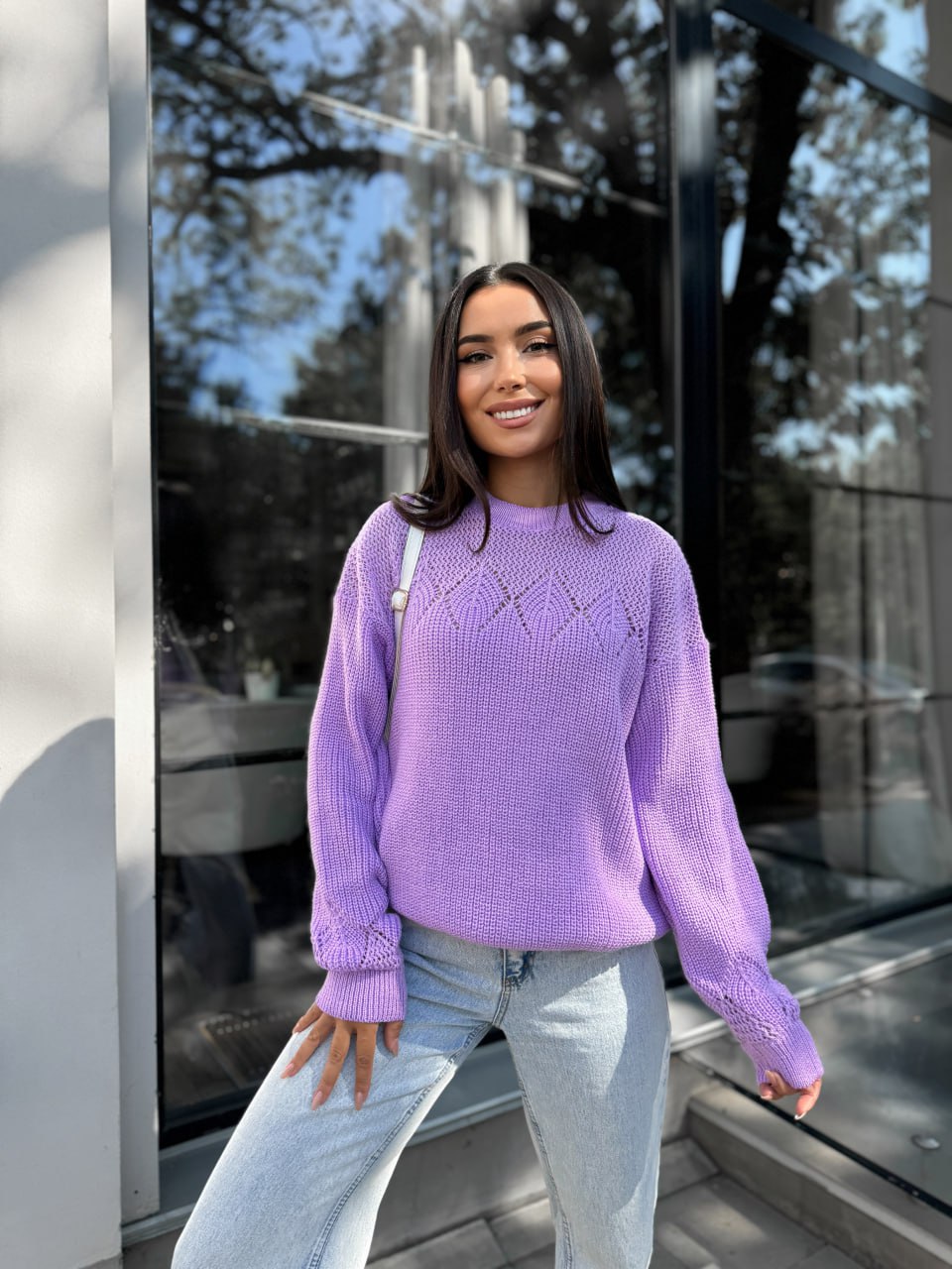Придбати, жіночий в’язаний светр з низьким горлом бузкового кольору, можна оптом і в роздріб з доставкою по всій Україні: Київ, Харків, Львів, Одеса, Дніпро, Запоріжжя та інші міста.