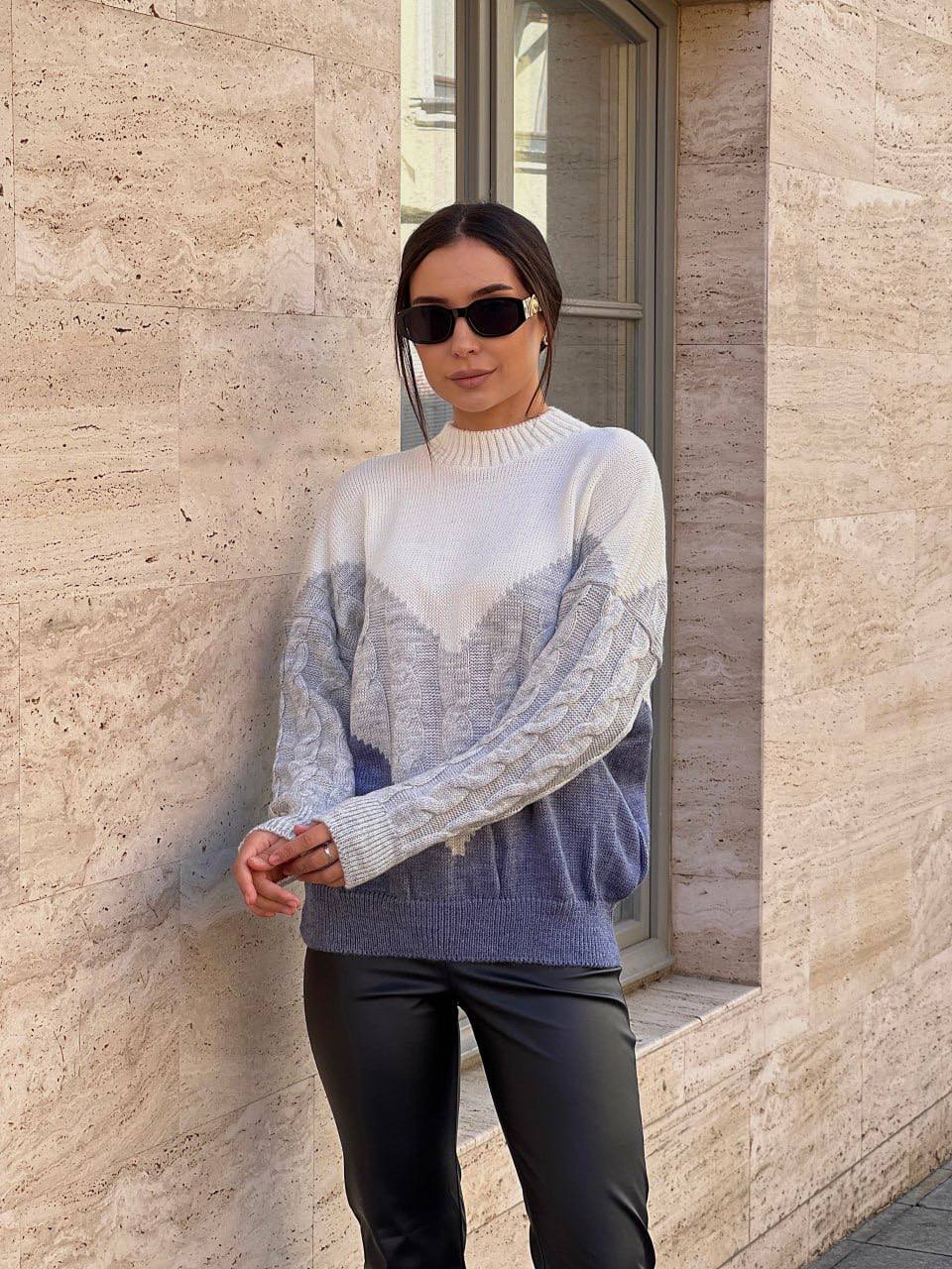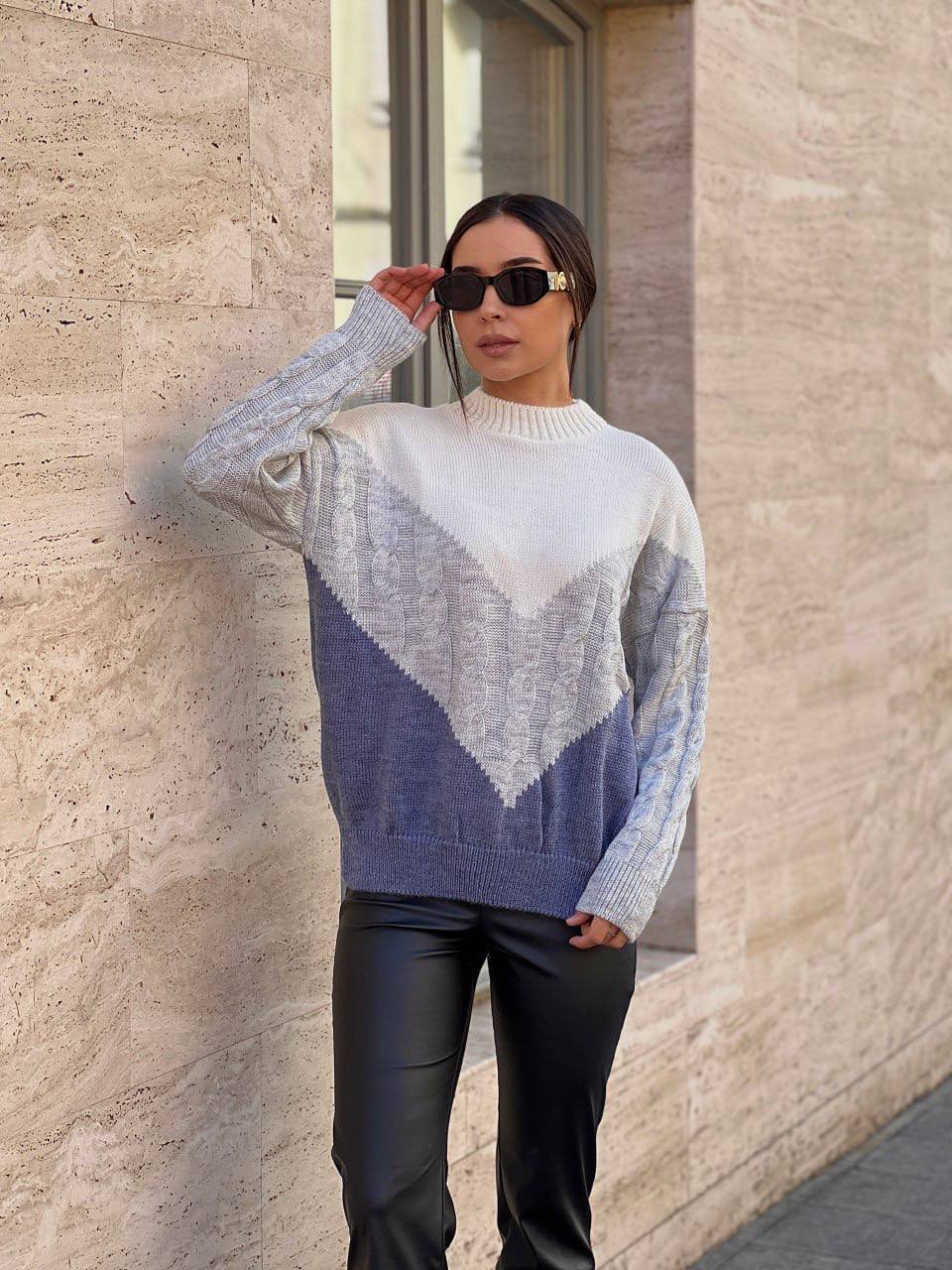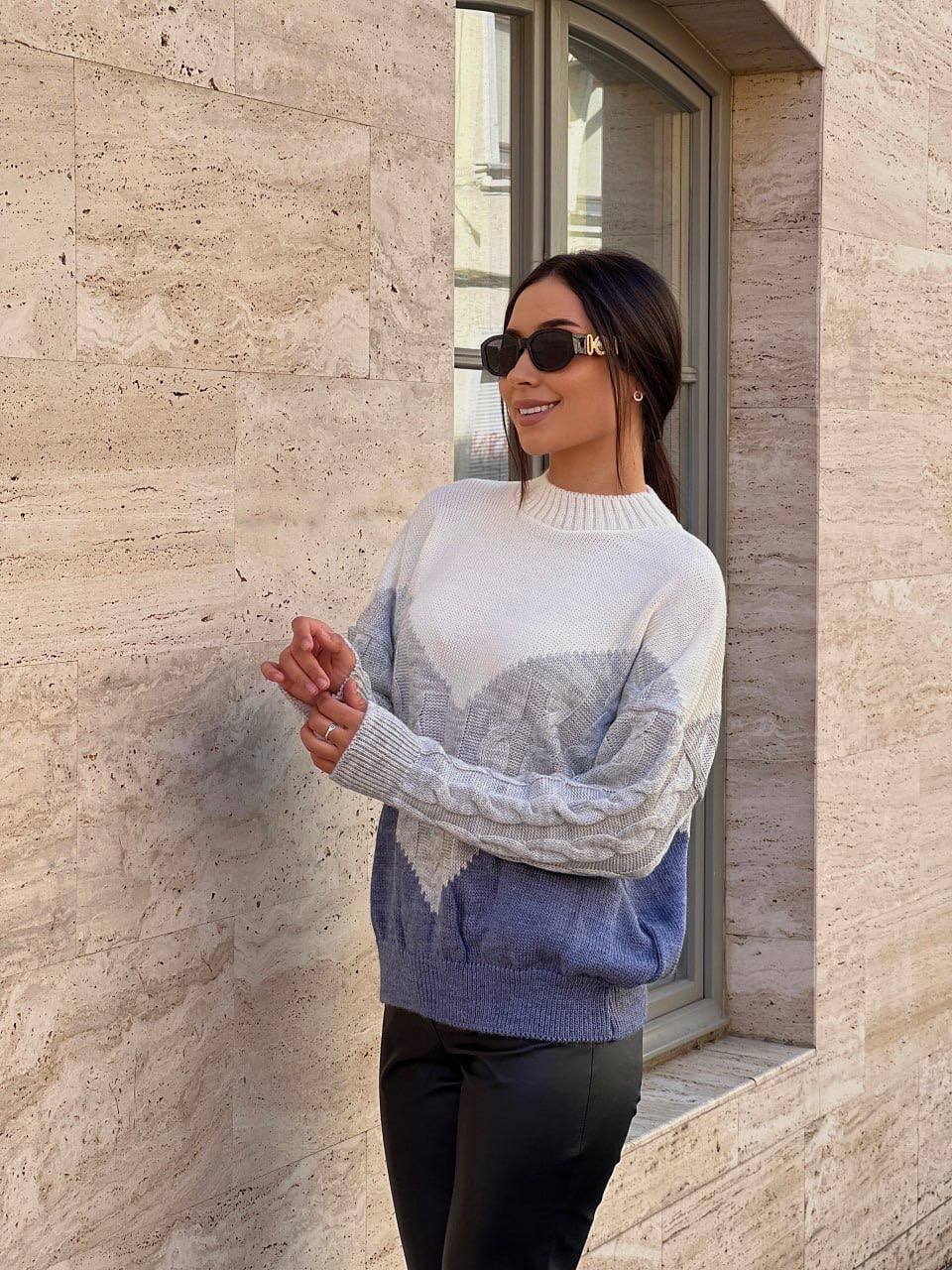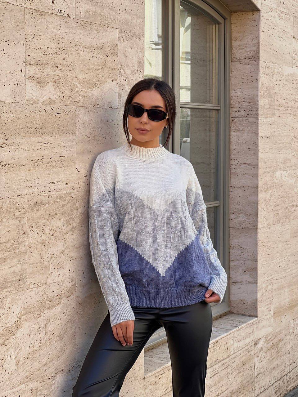 Жіночий в’язаний светр з низьким горлом молоко-сірий-джинс модель 5043 — ідеальний вибір для прохолодної осені та зими. Завдяки поєднанню акрилу та натуральної шерсті він одночасно теплий, м’який та зручний у щоденному носінні. Лаконічний фасон, універсальний розмір і стильні кольорові поєднання дозволяють легко створювати як повсякденні, так і більш елегантні образи.